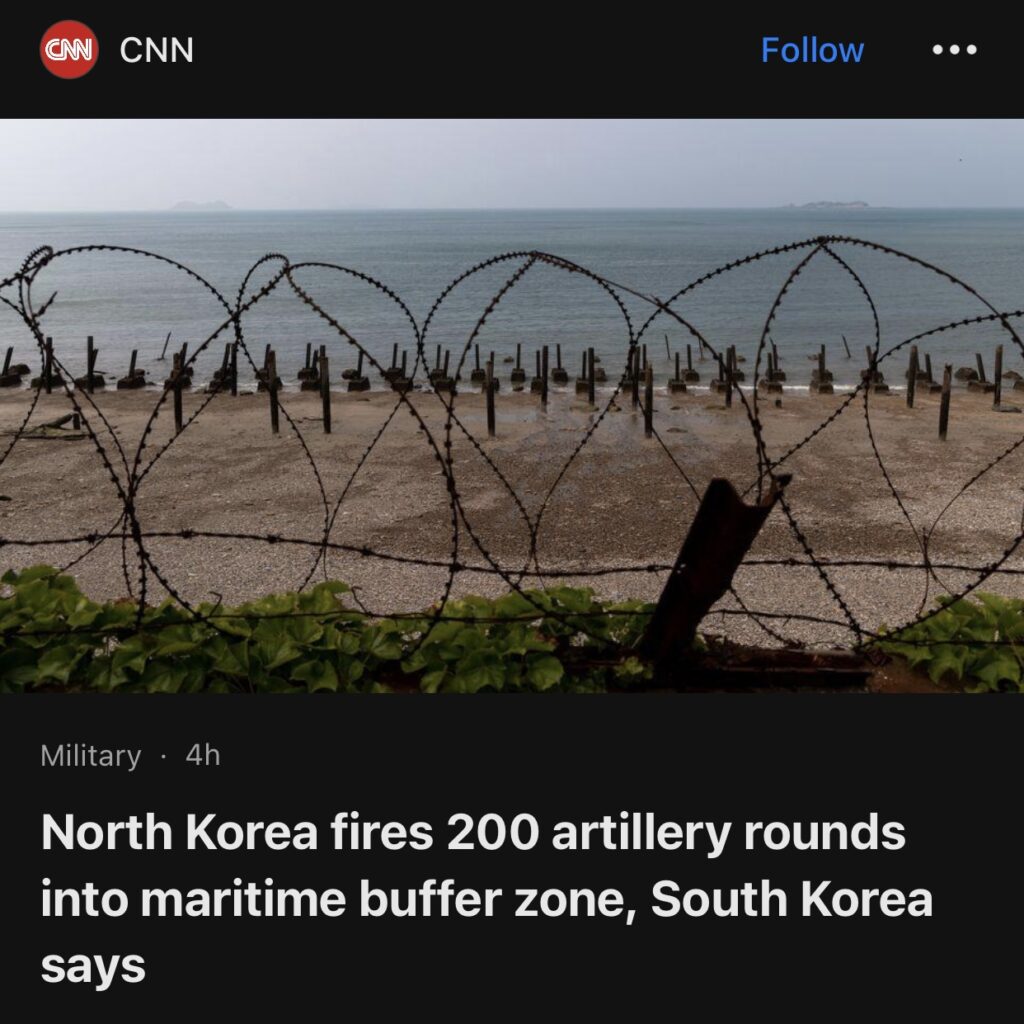 7。据CNN报道,韩国当局周五表示,朝鲜已在靠近韩国白翎岛和延坪岛的西海岸发射了 200 多发炮弹。韩国参谋长联席会议 (JCS) 表示,上午 9 点至 11 点之间,炮弹落在 NLL(北方界限线)以北的缓冲区内。没有对任何平民或军队造成损害。