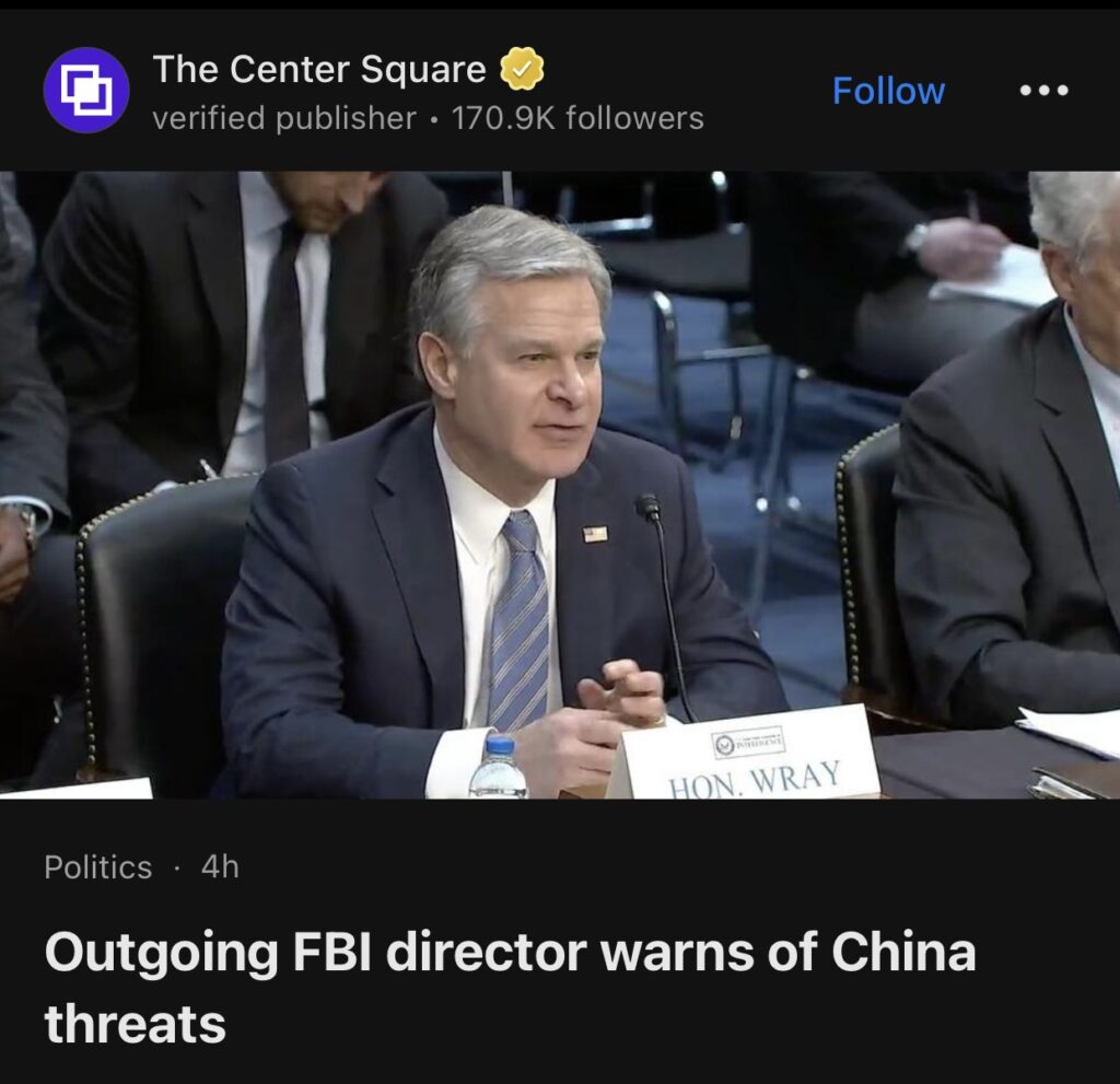 10。(中心广场)——即将离任的美国联邦调查局局长克里斯托弗·雷(Christopher Wray)向美国人发出的临别警告是,中国仍然是美国国家安全的最大威胁之一,这是他在过去几年中不断发出的警告。