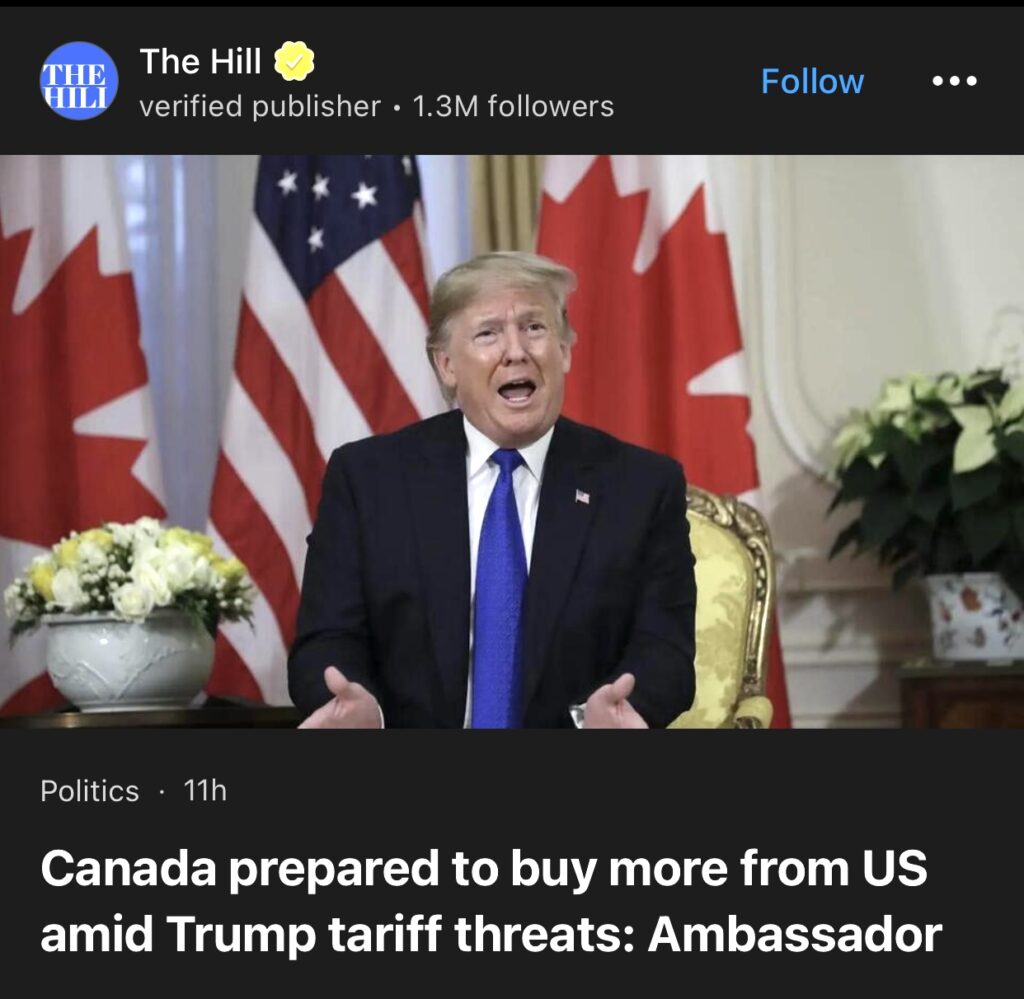 12。据美联社报道,加拿大驻美国大使确认,在当选总统特朗普威胁提高关税后,加拿大愿意增加美国进口。”我们很高兴从美国采购我们能买到的东西。我们即将进行一些大型军事采购,例如更换我们的整个潜艇舰队,”大使克尔斯滕·希尔曼在周一发表的一篇文章中告诉美联社。