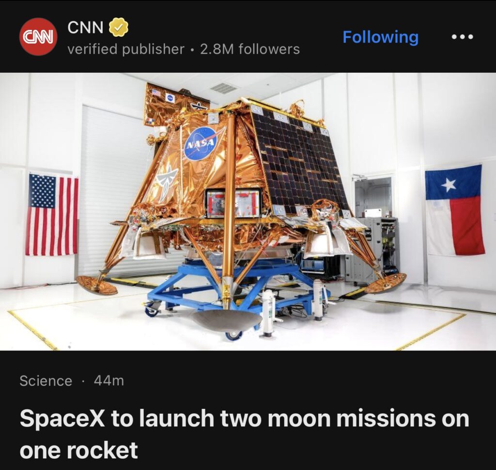 5。据CNN 报道,SpaceX 将用一枚火箭发射两次月球任务。