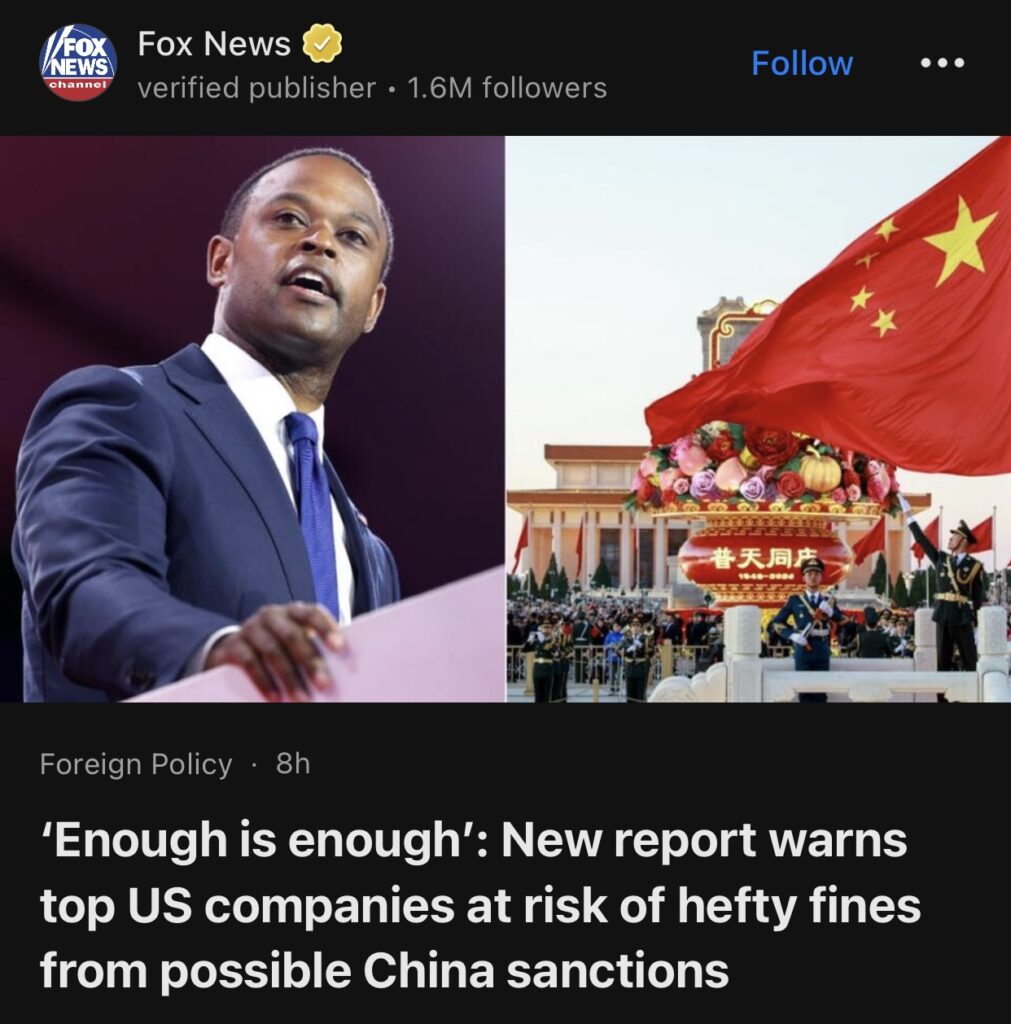 3。据Fox News报道,新报告警告美国顶级公司可能因中国制裁而面临巨额罚款。
