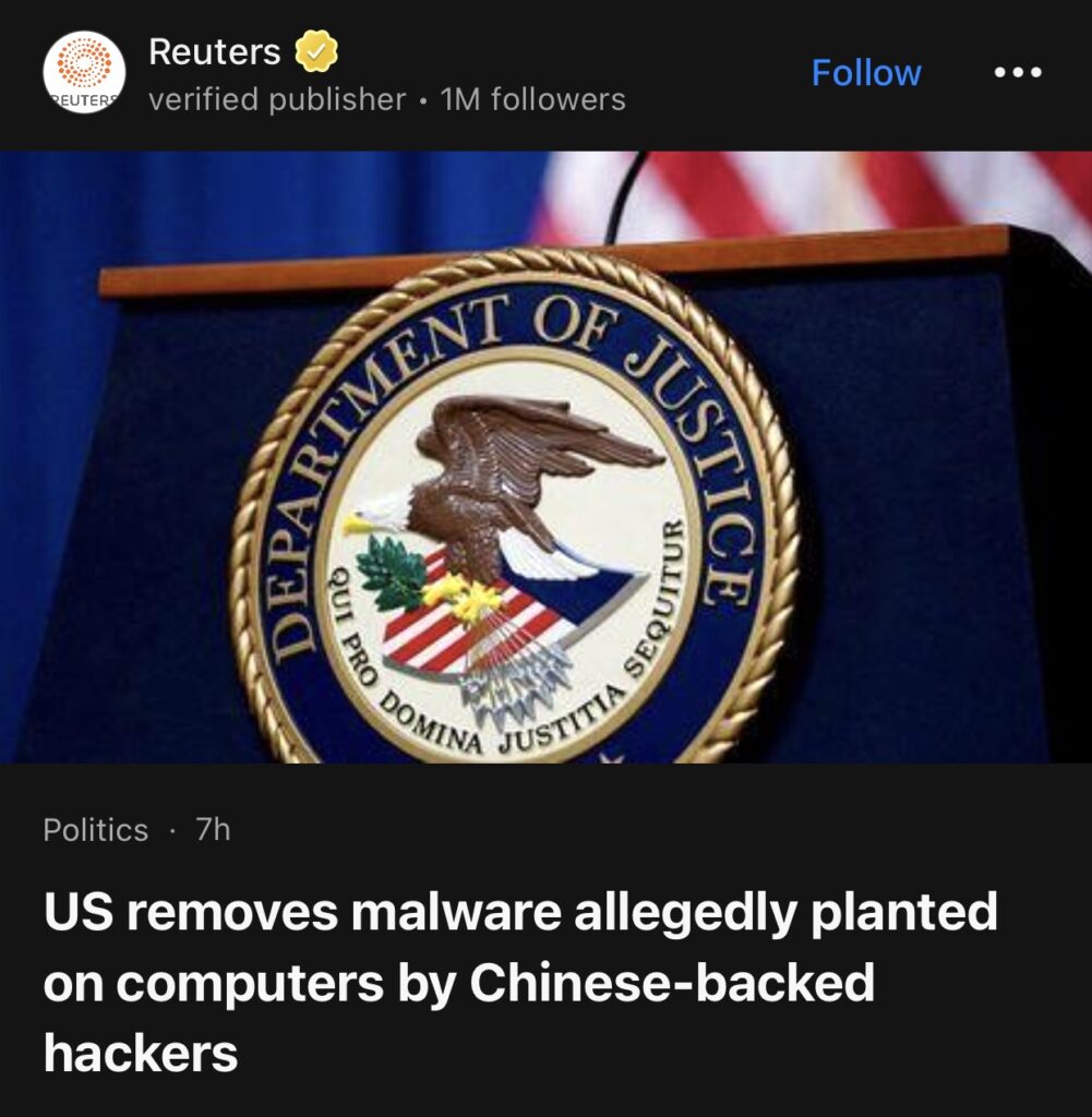 1。华盛顿(路透社) – 美国司法部周二表示,已删除由中华人民共和国支持的犯罪黑客组织在 4,200 多台计算机上植入的恶意软件。