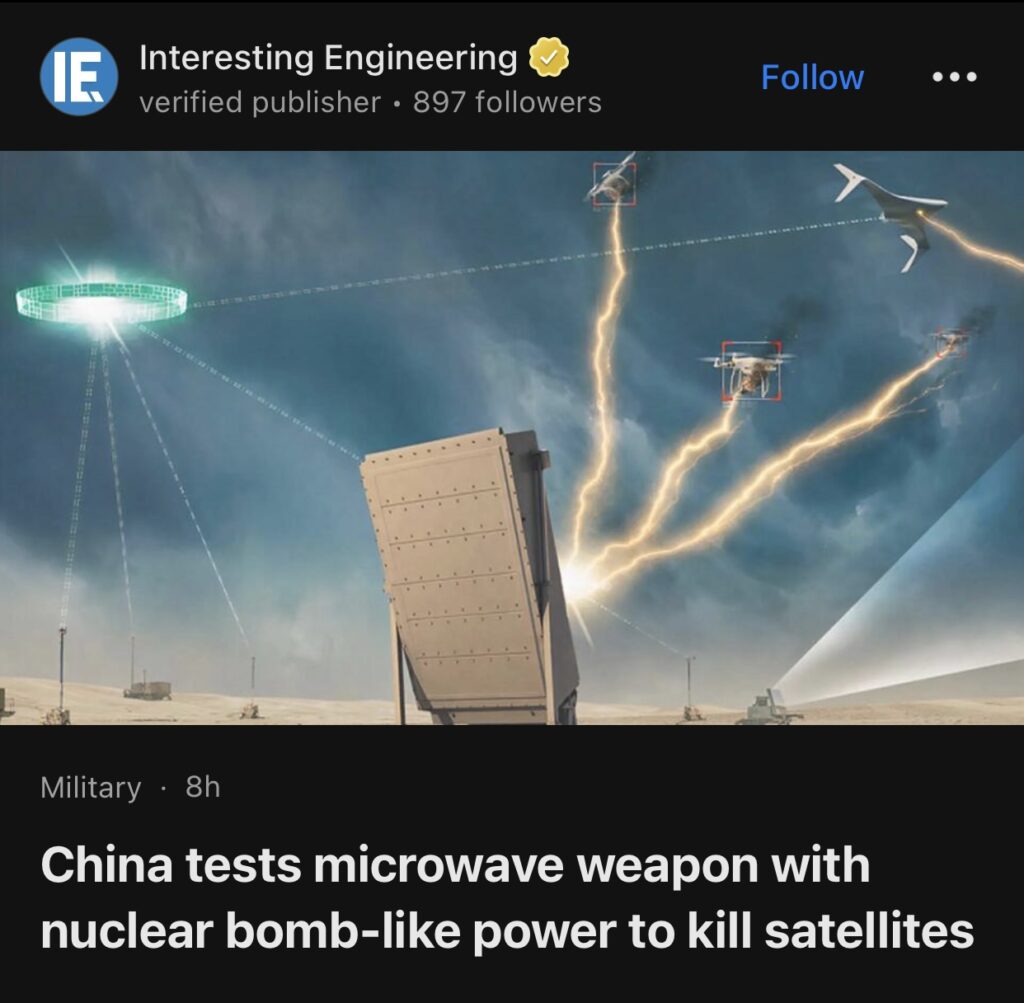 2。据称,中国研究人员开发了一种新型高功率微波(HPM)武器,其功率相当于核爆炸释放的电磁能。据报道,这种新武器也相对紧凑,可能会改变反无人机和反卫星军事行动的游戏规则。
