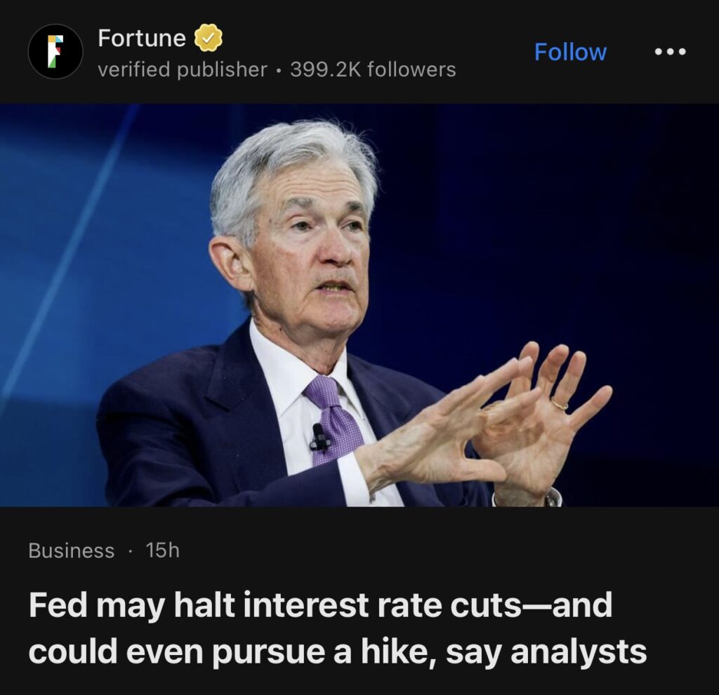 14。据Fortune报道,分析师表示,美联储可能会停止降息,甚至可能加息。