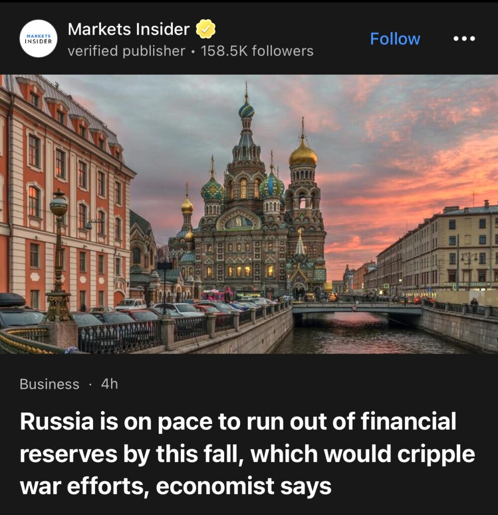 11。据Markets Insider报道,经济学家称,俄罗斯将在今年秋天耗尽财政储备,这将削弱战争努力。