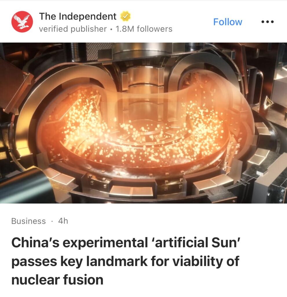 3。据The Independent报道,中国实验“人造太阳”跨越了核聚变可行性的关键里程碑。