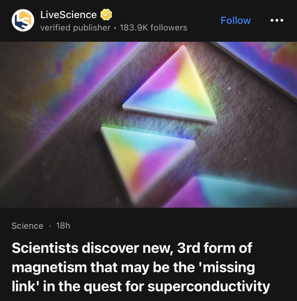 5。据LiveScience报道,科学家发现新的第三种磁性形式,可能是探索超导过程中的“缺失环节”。