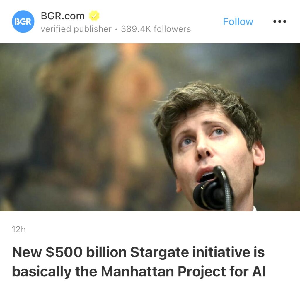 1。据BGR.com报道,新的 5000 亿美元“星际之门”计划,基本上是人工智能的”曼哈顿计划”。