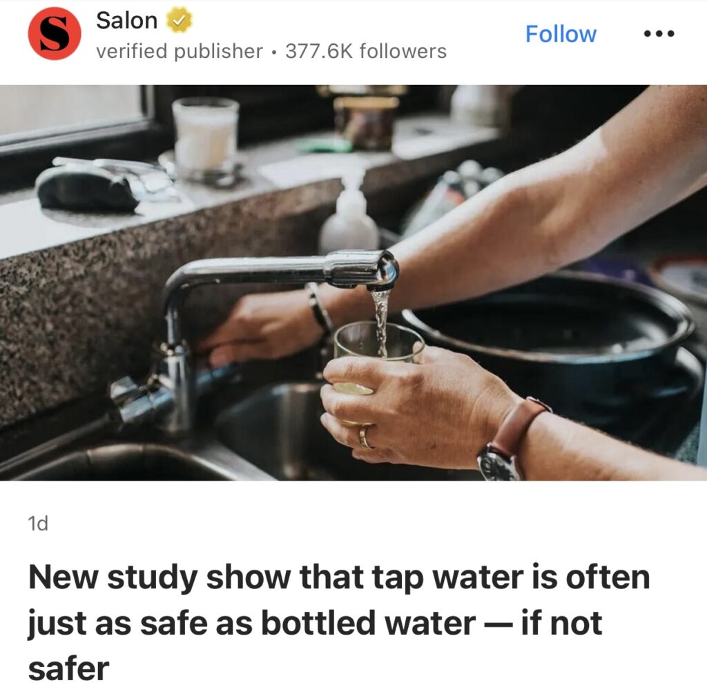 12。据Salon报道,新研究表明,自来水通常与瓶装水一样安全——甚至更安全。《英国医学杂志全球健康》发表的一项新研究表明,饮用自来水可能比瓶装水“更健康”。作者指出,“对瓶装水和自来水的安全性和潜在风险的误解仍然存在”,并强调“自来水通常是安全、廉价、方便且环保的”。