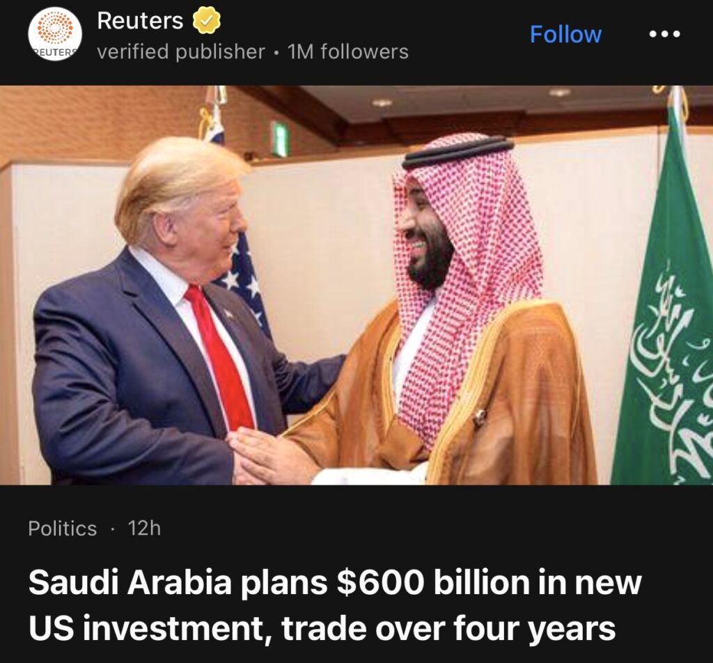 6。(路透社) – 沙特国家通讯社周四早些时候称,沙特阿拉伯王储穆罕默德·本·萨勒曼告诉美国总统唐纳德·特朗普,沙特希望在未来四年内投入 6000 亿美元扩大与美国的投资和贸易。