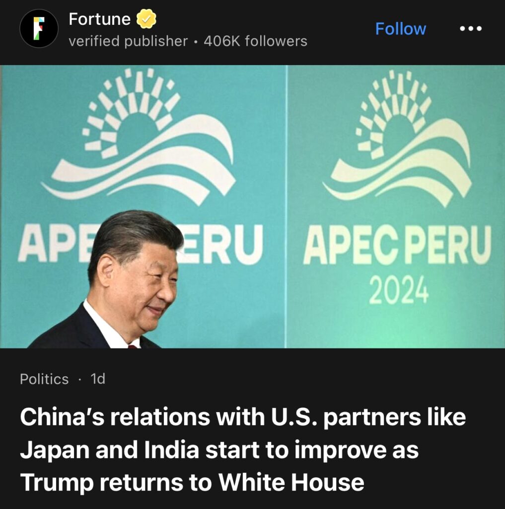 10。据Fortune报道,随着特朗普重返白宫,中国与美国伙伴日本和印度等国的关系开始改善。