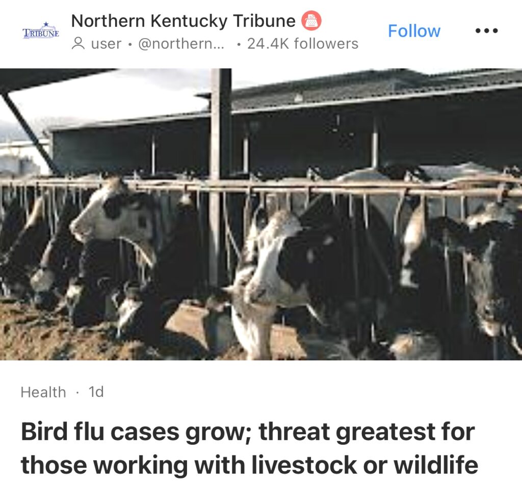 1。据Kentucky Health News报道,禽流感病例增加;对于那些从事牲畜或野生动物工作的人来说,威胁最大。