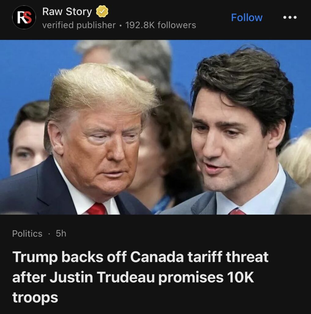 6。据Raw Story报道,贾斯汀·特鲁多承诺向美加边境派遣 1 万名军队后,唐纳德·特朗普总统同意至少一个月内不对加拿大征收关税。