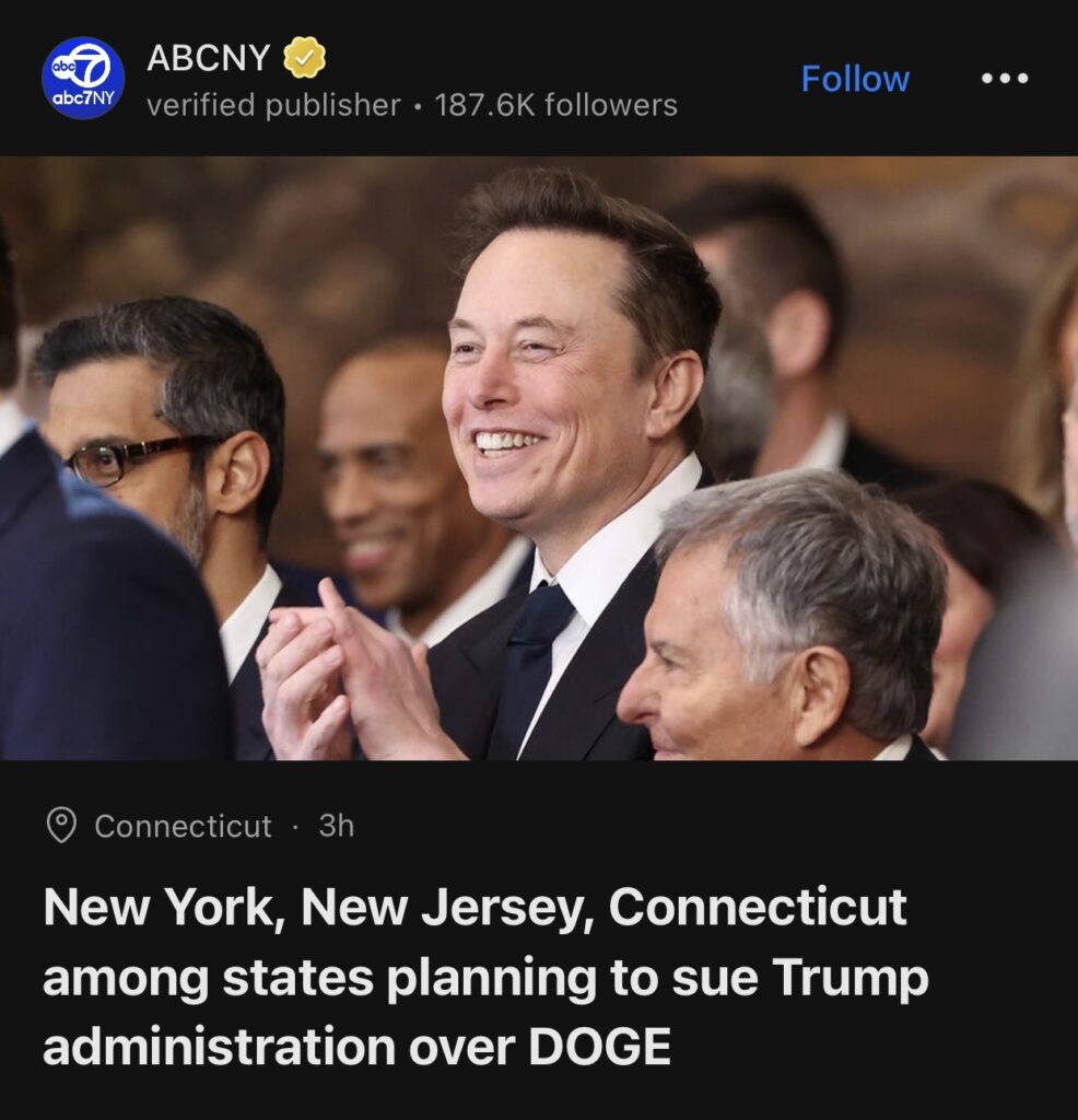 12。据ABCNY报道,纽约、新泽西、康涅狄格等州计划就 DOGE (政府效率部)起诉特朗普政府。州总检察长表示,这起诉讼是对财政部允许埃隆·马斯克和DOGE 访问包含美国人个人身份信息的敏感支付系统的回应。
