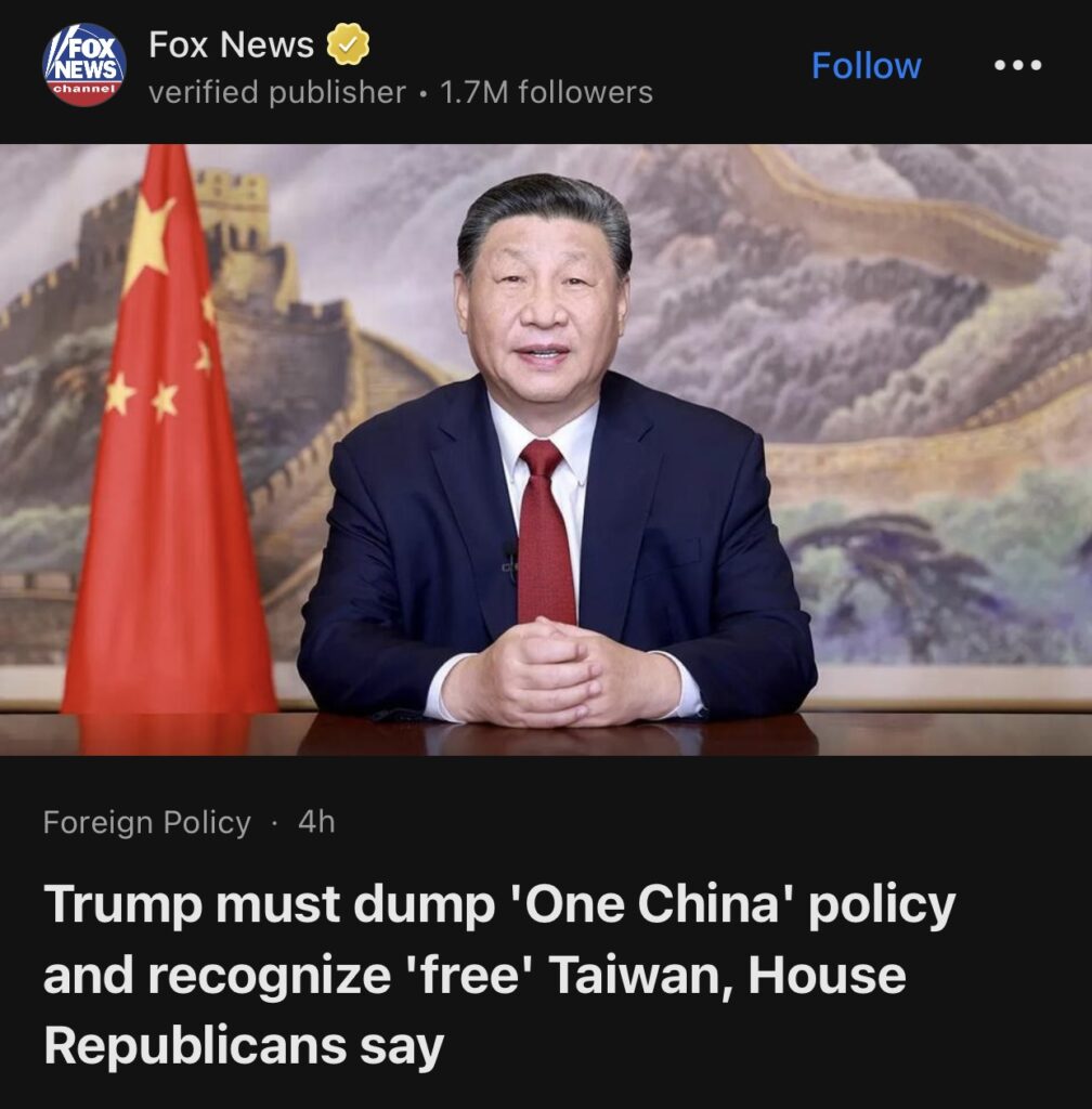 7。据Fox News报道,美国众议院共和党人称特朗普必须放弃“一个中国”政策并承认“自由”台湾。来自不同政治派别的二十多名众议院共和党议员,支持一项正式承认台湾的决议,此举打破了美国现行政策,可能会激怒北京领导人。