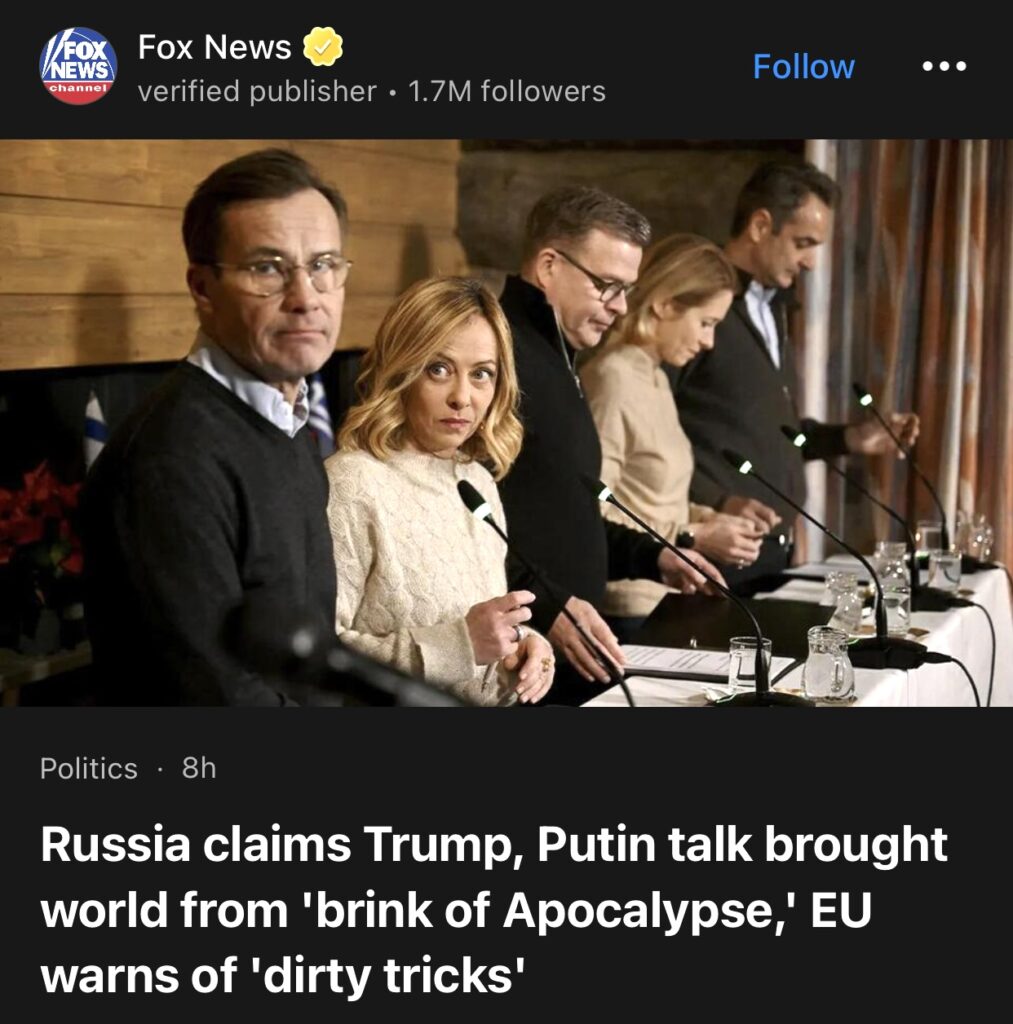 6。据Fox News报道,俄罗斯声称特朗普和普京的谈话将世界从“世界末日的边缘”带出来,而欧盟则警告“肮脏的伎俩”。
