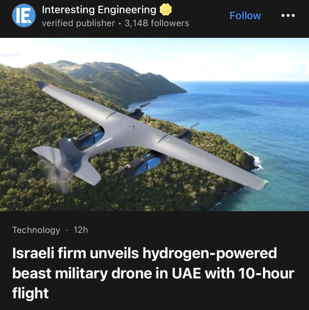 11。据Interesting Engineering报道,以色列公司在阿联酋推出氢动力野兽军用无人机,可飞行 10 小时。