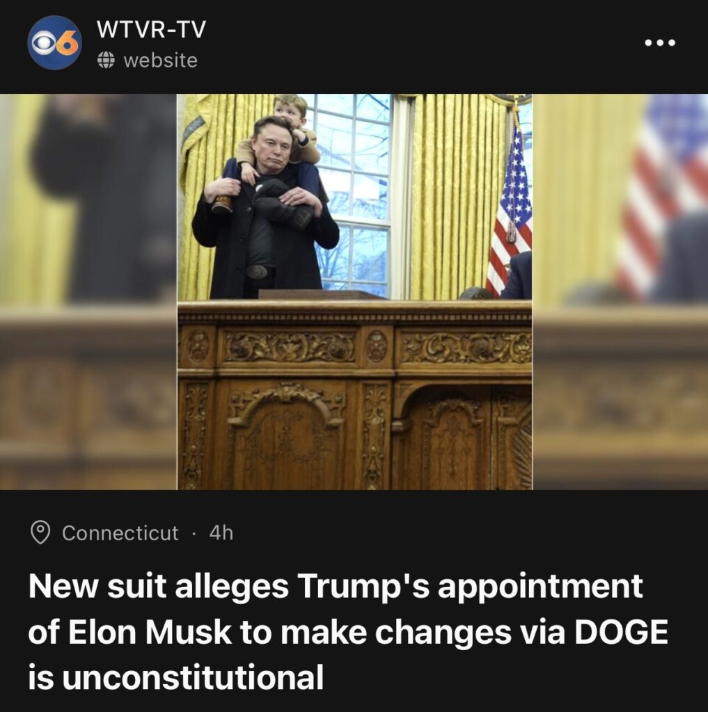 7。据NATIONAL POLITICS报道,新诉讼称特朗普任命埃隆·马斯克通过 DOGE 做出改变是违宪的。