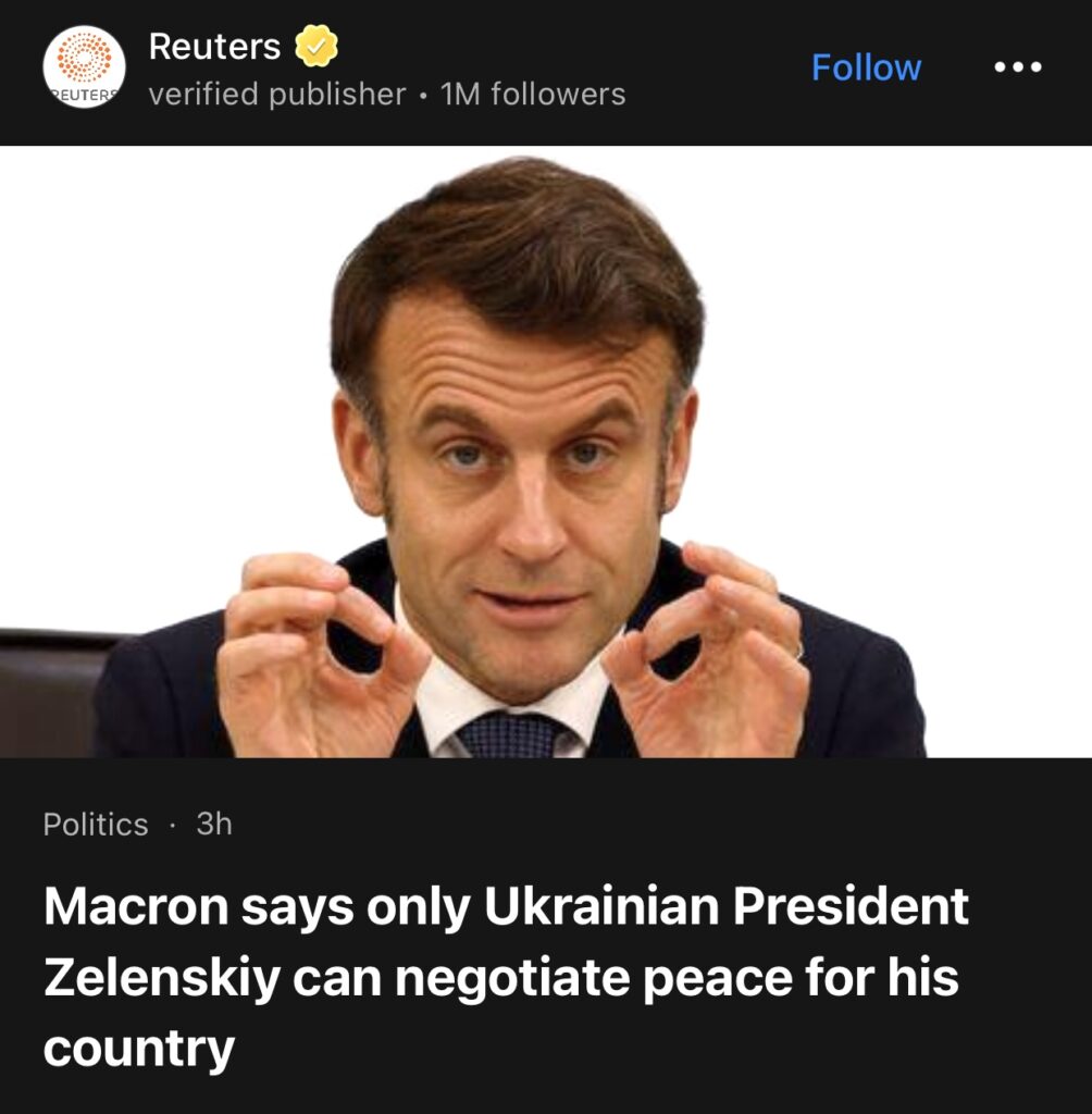 15。(路透社) – 据英国《金融时报》周四报道,法国总统埃马纽埃尔·马克龙表示,只有乌克兰总统弗拉基米尔·泽伦斯基才能代表乌克兰与俄罗斯进行谈判以结束战争,并警告说,“投降的和平”将是“对所有人来说都是坏消息”,包括美国。
