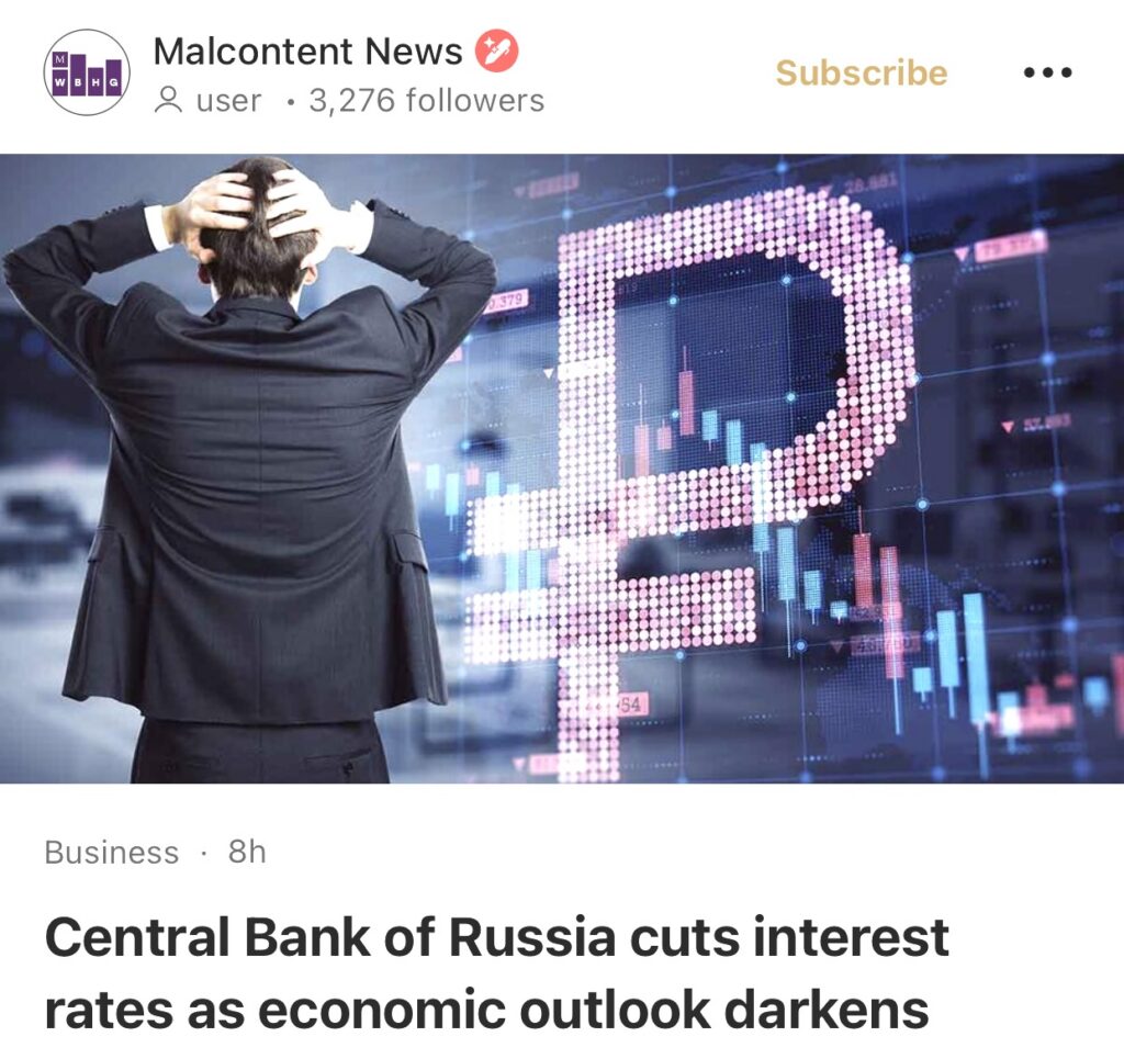 12。据Malcontent News报道,俄罗斯央行因经济前景黯淡而下调利率。