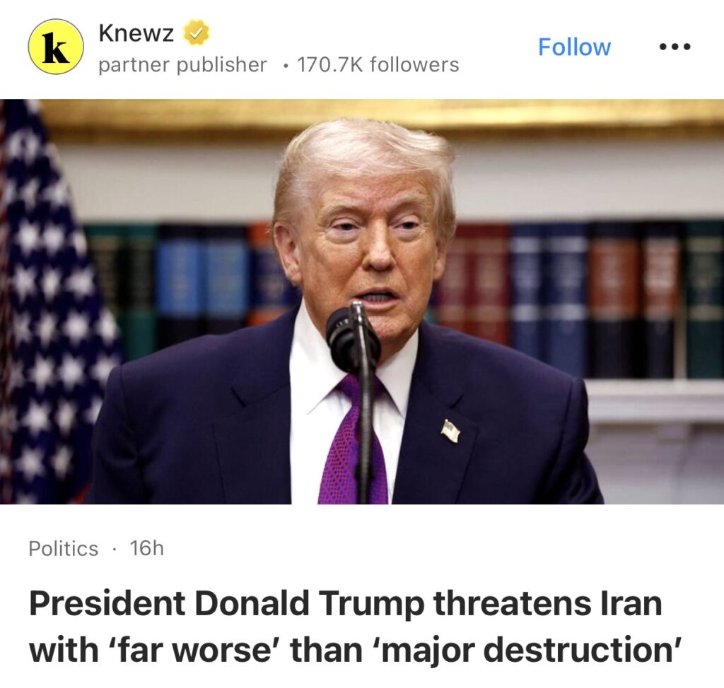 15。据Knewz报道,唐纳德·特朗普向伊朗发出警告,宣称美国准备发动比2025年6月对伊朗核设施发动的袭击“严重得多”的攻击。