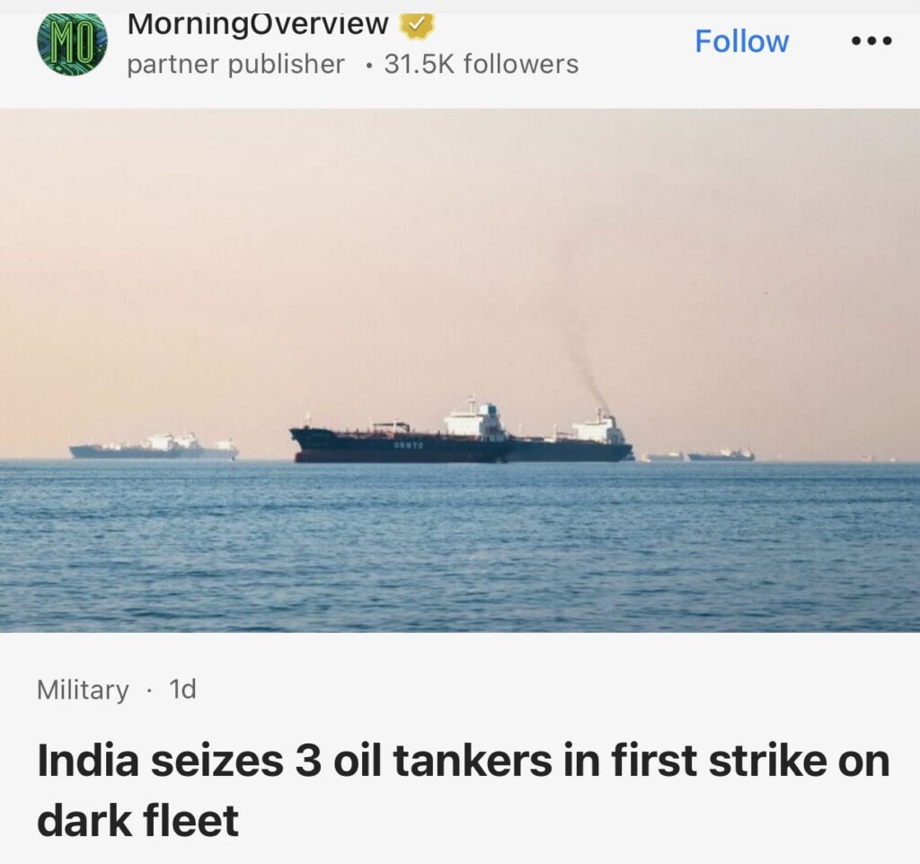 4。据MorningOverview报道,印度首次直接打击“暗船队”的行动已经展开,扣押了三艘油轮,此举震动了支撑受制裁伊朗石油出口的秘密贸易。