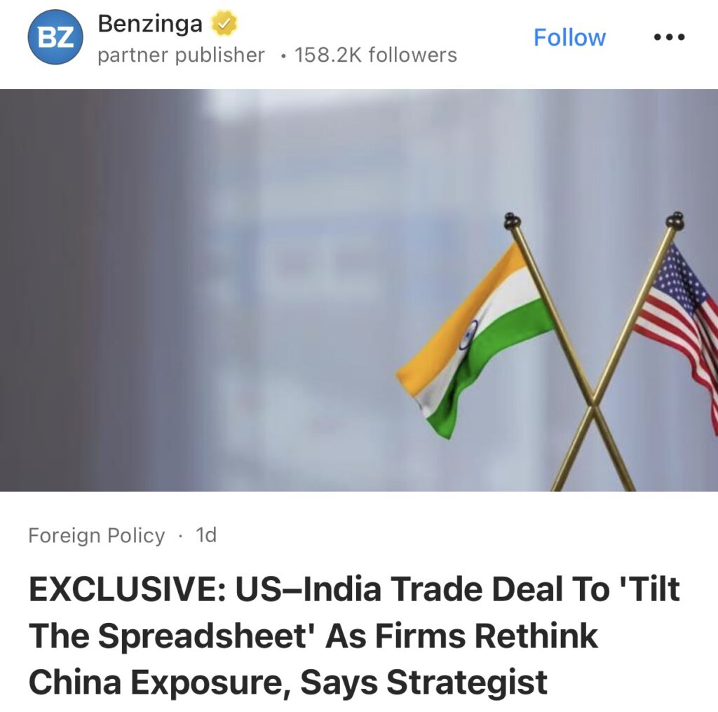 13。据Benzinga独家报道:策略师称,美印贸易协议将“改变格局”,企业将重新评估对华投资。