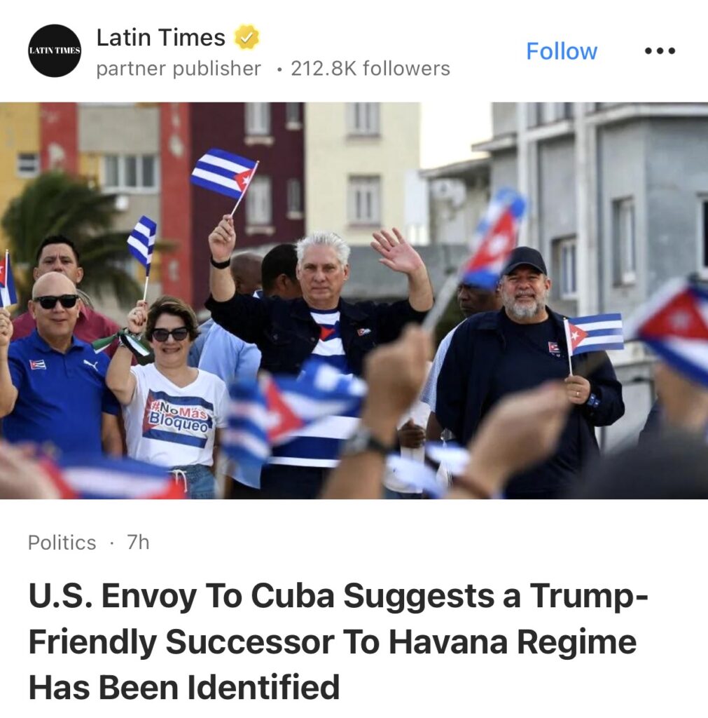 2。据Latin Times报道,美国驻古巴特使暗示,已确定一位对特朗普友好的哈瓦那政权继任者。