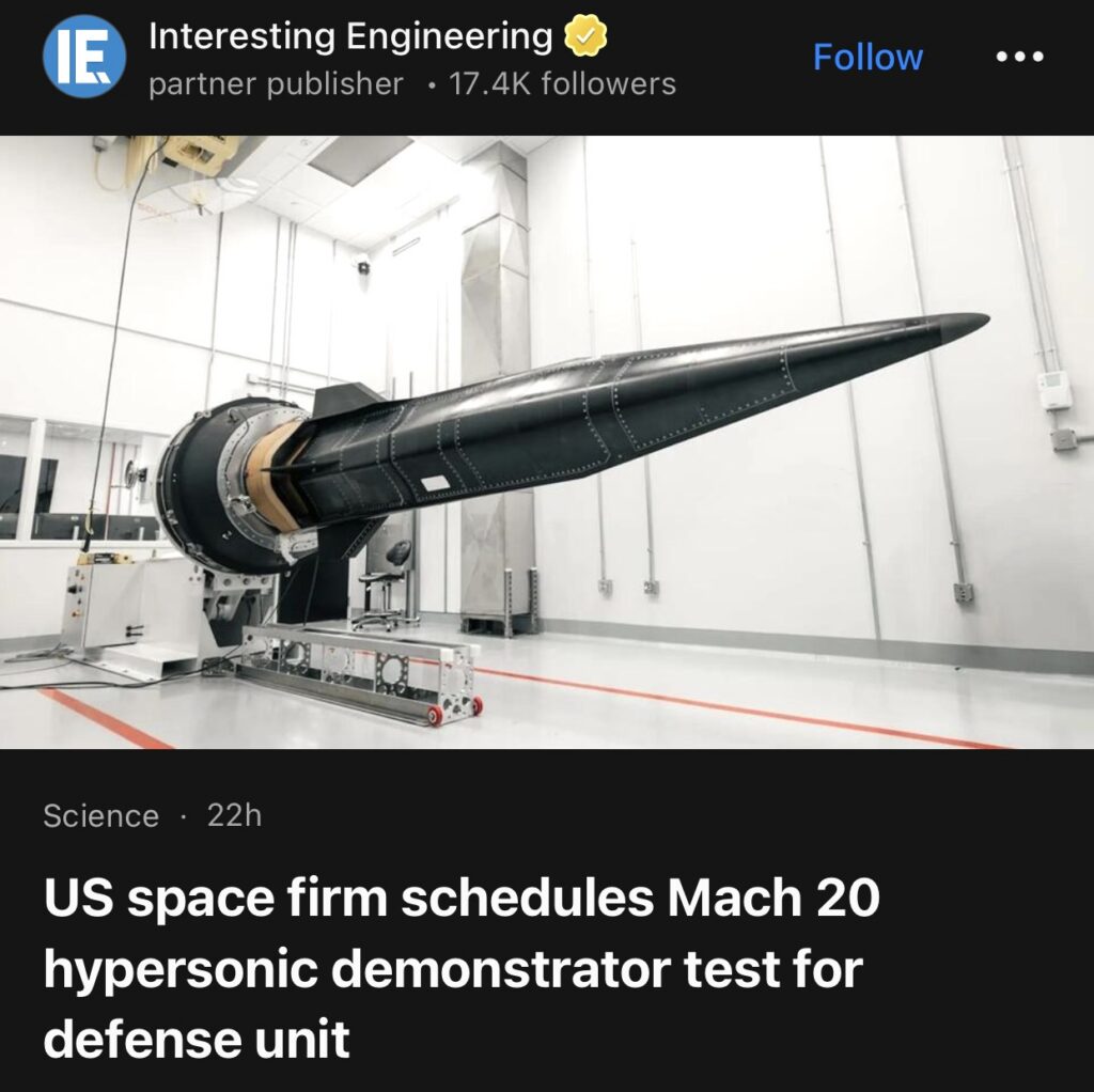 10。据Interesting Engineering报道,美国航天公司火箭实验室,将于本月晚些时候使用其HASTE火箭,为国防部门安排20马赫高超音速演示验证机测试。HASTE是高超音速加速器亚轨道测试电子火箭的简称,专门设计用于执行亚轨道任务,以测试高超音速飞行能力。