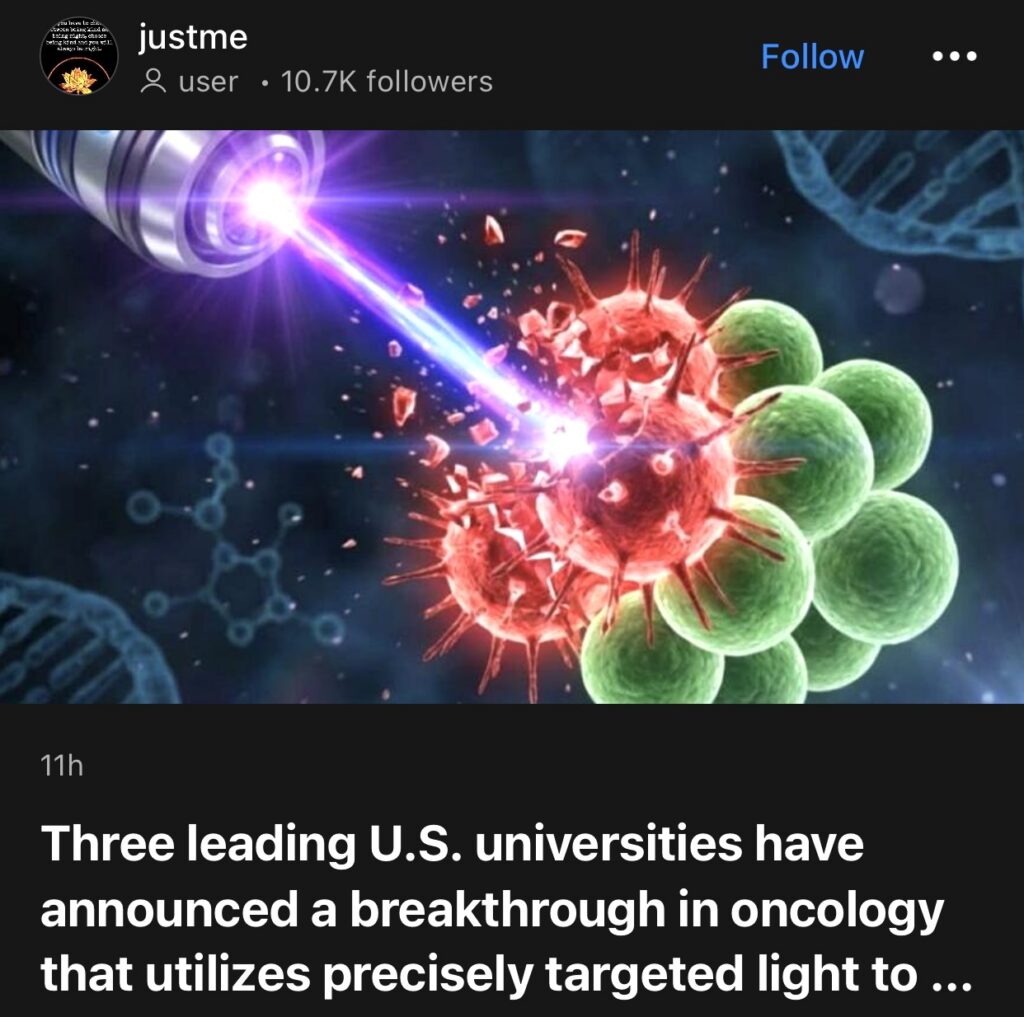 10。据JustMe 报道,美国三所顶尖大学宣布在肿瘤学领域取得突破性进展,利用精准靶向光疗法治疗癌症,摒弃了传统的侵入性治疗方法。实验室测试表明,这种光疗法无需化疗、毒性药物或放射治疗,即可成功清除99%的侵袭性癌细胞。该方法标志着癌症治疗领域向无毒干预方向的重大转变,其重点在于保护健康的生物系统。