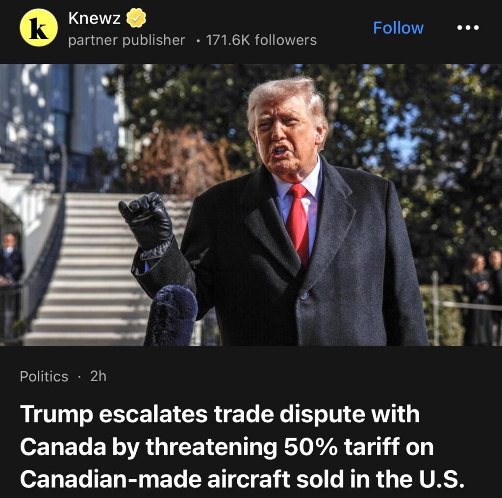 13。据Knewz报道,特朗普威胁对销往美国的加拿大制造飞机征收 50% 的关税,加剧了与加拿大的贸易争端。