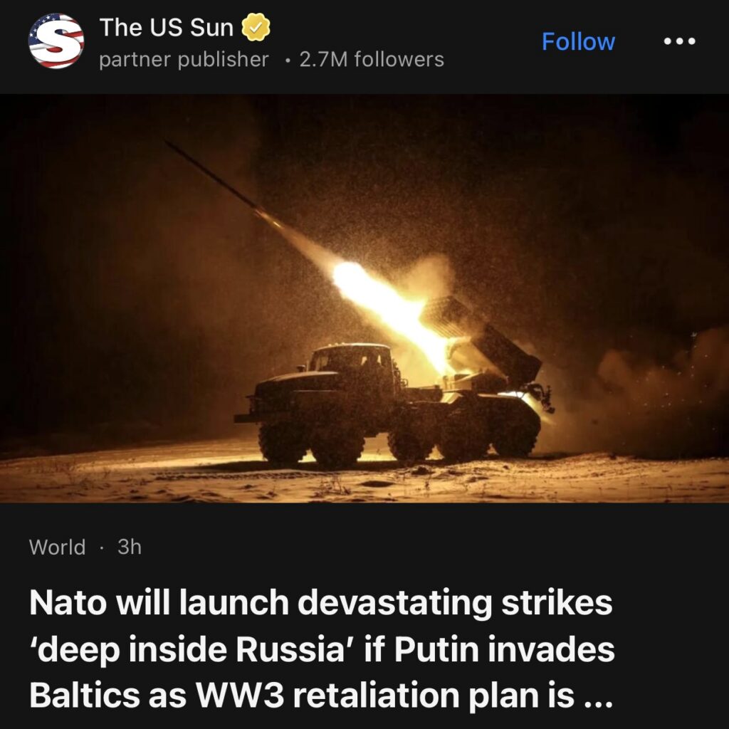 2。据The US Sun报道,若普京入侵波罗的海国家,北约将对俄罗斯“纵深地带”发动毁灭性打击,第三次世界大战报复计划曝光。