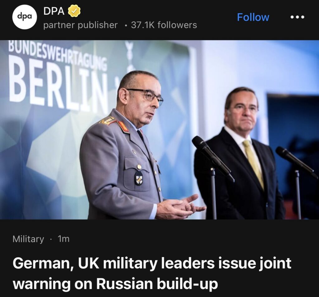 9。据DPA报道,德国和英国的高级军事领导人敦促欧洲各国做好应对俄罗斯可能发动的袭击的准备。德国联邦国防军总监察长卡斯滕·布鲁尔和英国武装部队总司令理查德·奈顿在周一发表的一份联合呼吁中警告说,莫斯科正日益将其军事重心转向西方。