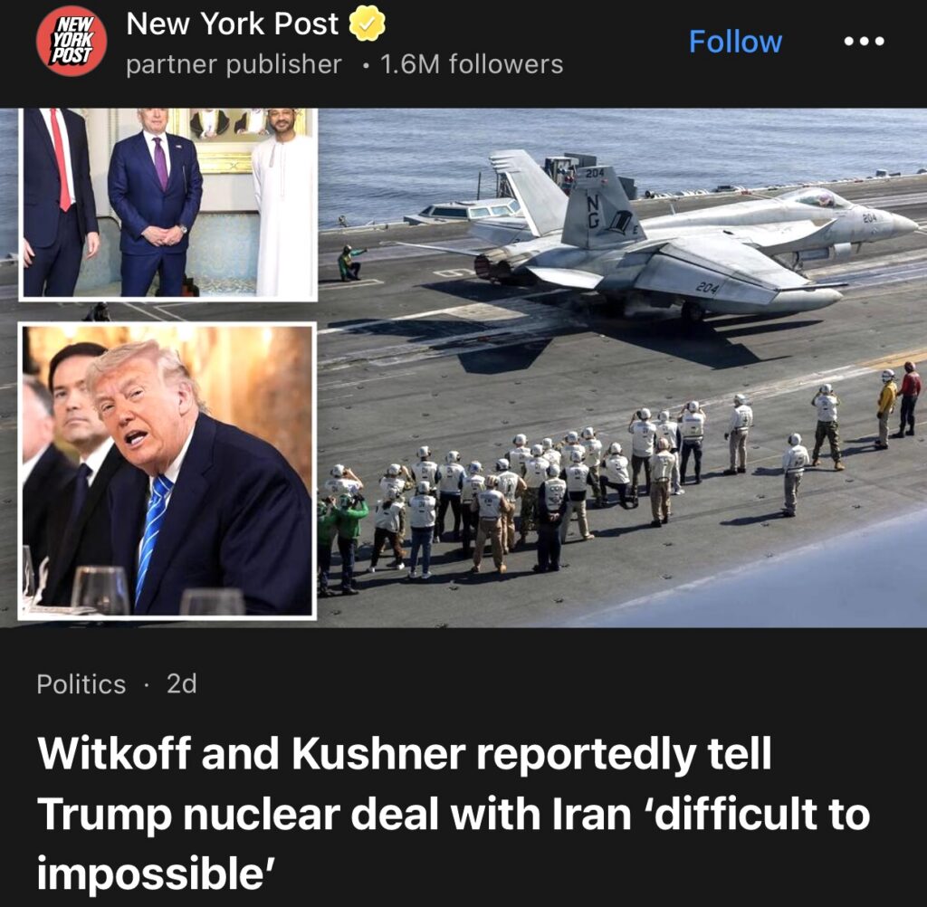 4。据New York Post报道,维特科夫和库什纳告诉特朗普,与伊朗达成核协议“困难重重,甚至不可能”。