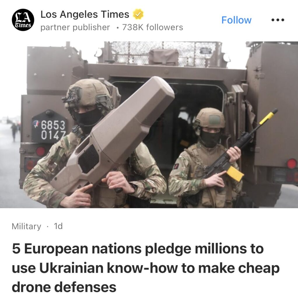 9。据Los Angeles Times 报道,5个欧洲国家承诺投入数百万美元,利用乌克兰的技术制造廉价的无人机防御系统。