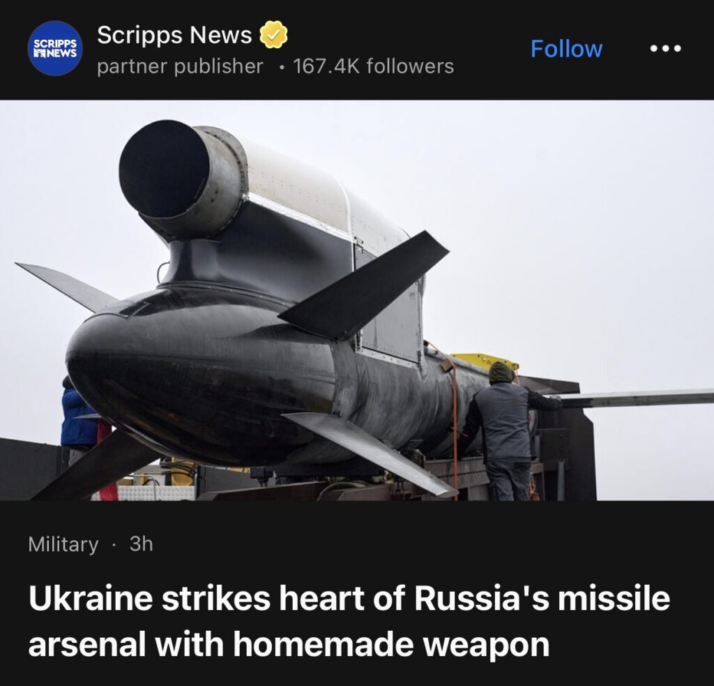 4。据Scripps News报道,乌克兰用自制武器击中俄罗斯导弹库核心地带。周六晚,乌克兰袭击了俄罗斯最具战略意义的国防设施之一——沃特金斯克机械制造厂。该厂位于偏远地区,距离乌克兰边境近 800 英里,这是乌克兰使用国产武器发动的最远距离打击。