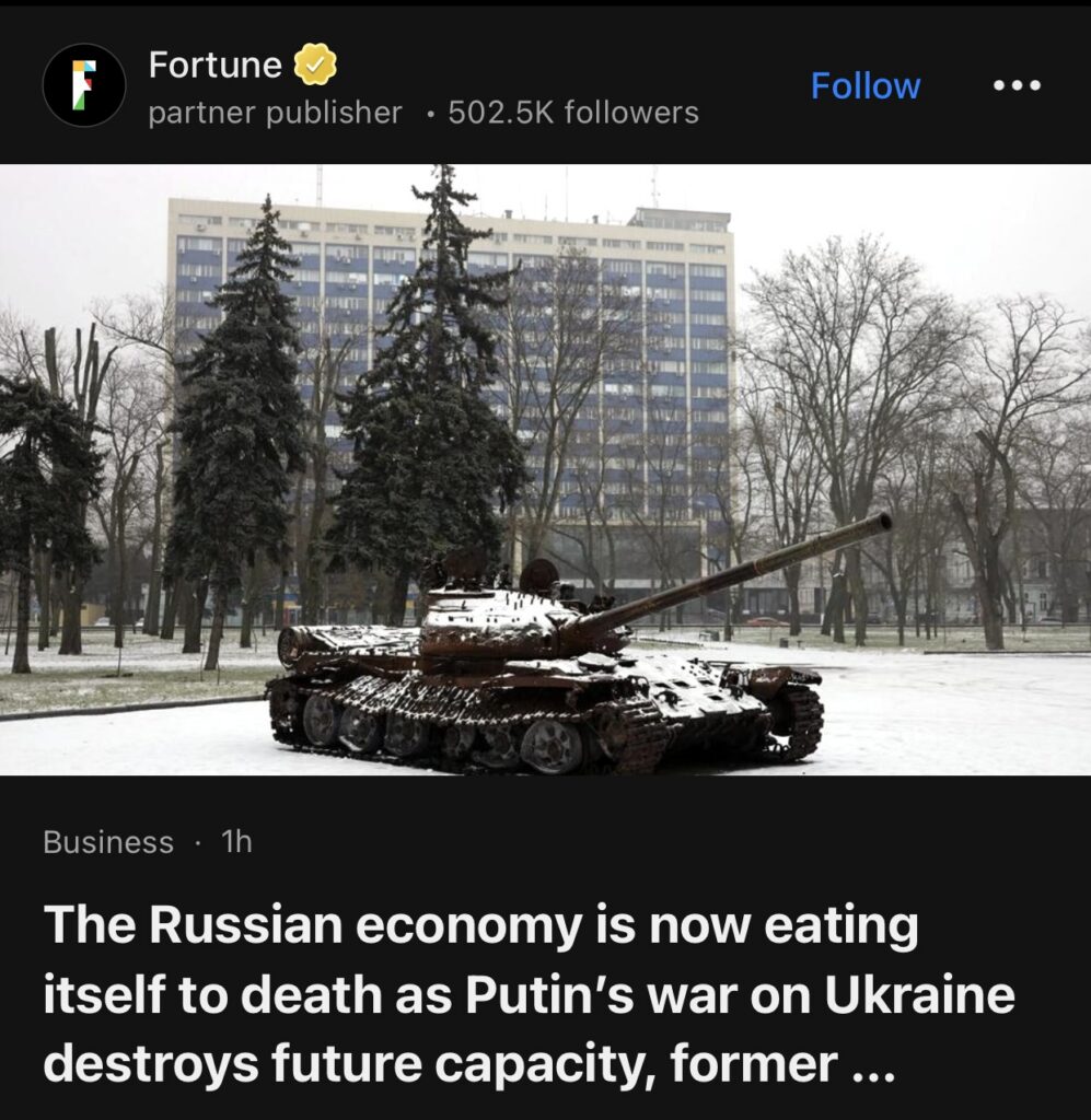 12。据Fortune报道,俄罗斯前央行顾问表示,普京对乌克兰的战争正在摧毁俄罗斯未来的发展能力,导致俄罗斯经济走向自我毁灭。