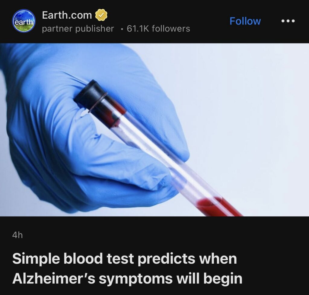 6。据Earth.com报道,简单的血液检查即可预测阿尔茨海默病症状何时出现。这项研究成果来自圣路易斯华盛顿大学医学院的研究人员。他们的模型能够将阿尔茨海默病症状的出现时间预测在三到四年之内。