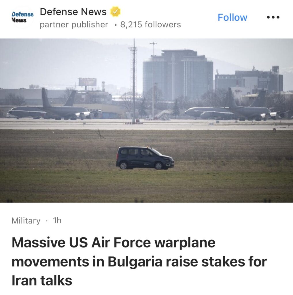 14。柏林——保加利亚索非亚国际机场周末期间两次短暂暂停民用航空运营,原因是美国军用飞机编队在该机场集结,这引发了人们的猜测,即华盛顿正在部署兵力,准备对伊朗发动潜在的打击。