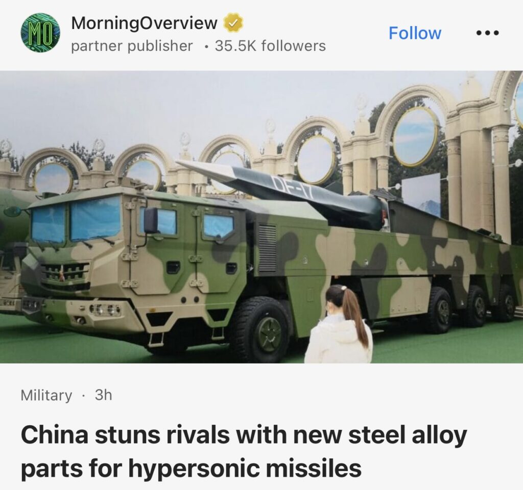 1。据MorningOverview报道,中国推出用于高超音速导弹的新型钢合金部件,令竞争对手震惊。