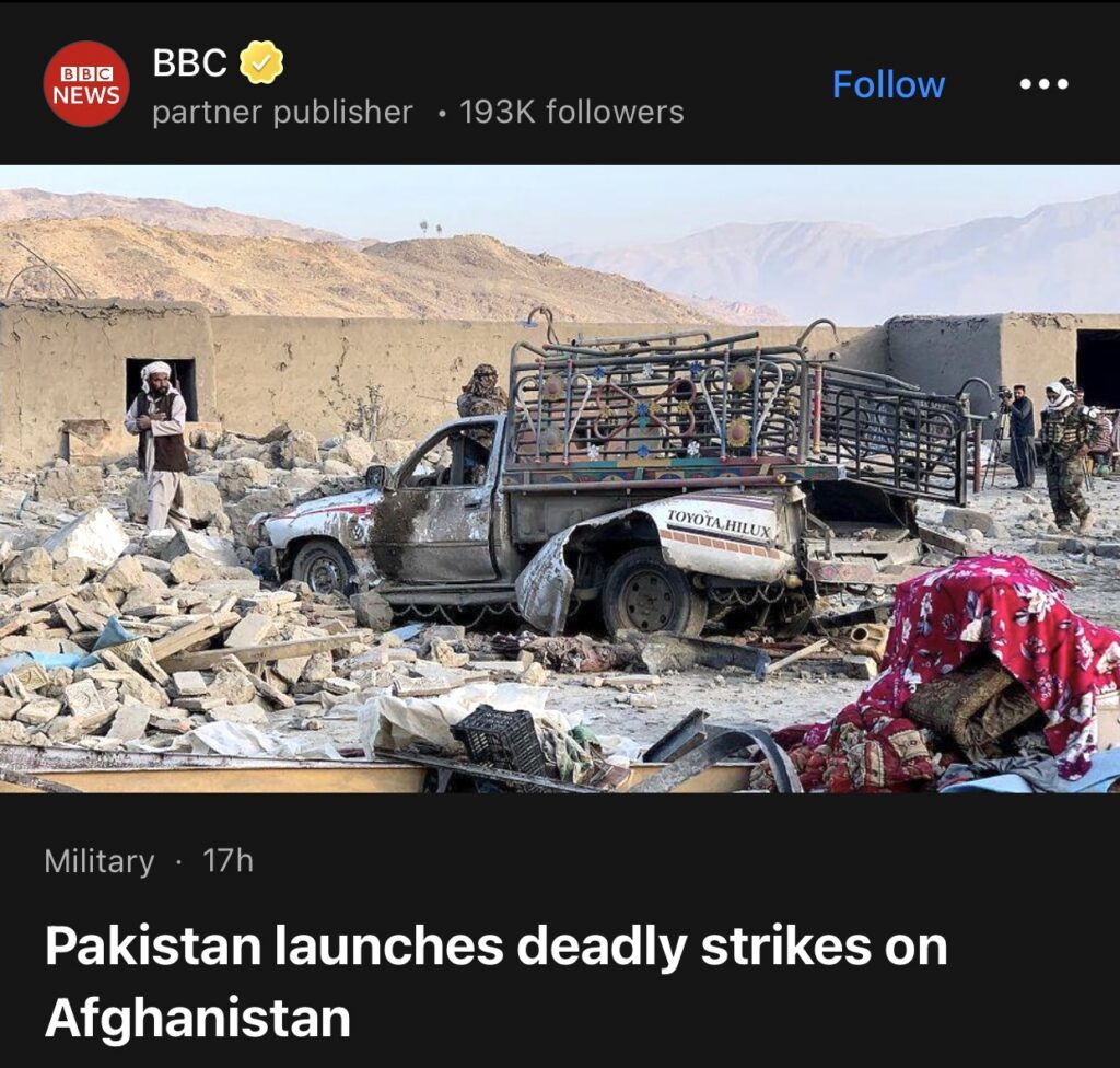13。据BBC报道,巴基斯坦对阿富汗进行了多次夜间空袭,塔利班称空袭造成至少 18 人死亡,其中包括妇女和儿童。