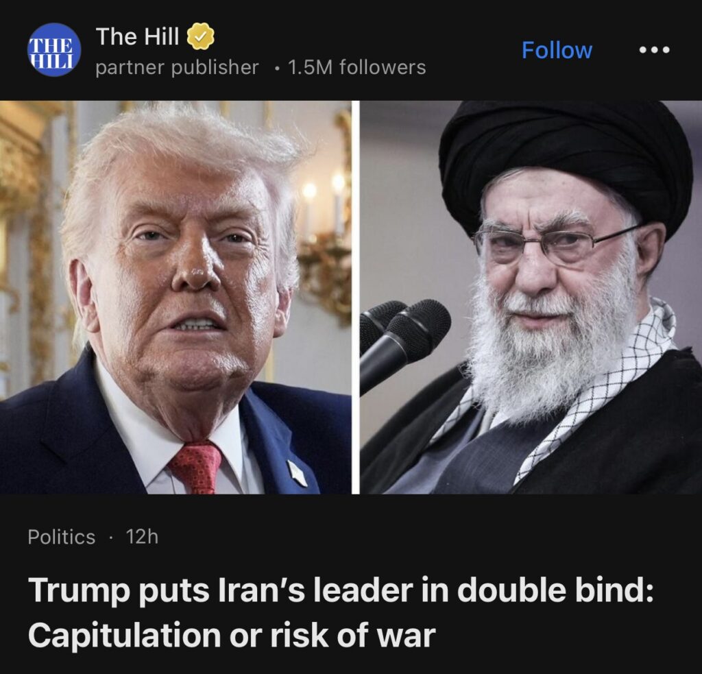 15。据The Hill报道,特朗普让伊朗领导人陷入两难境地:要么投降,要么冒着战争风险。