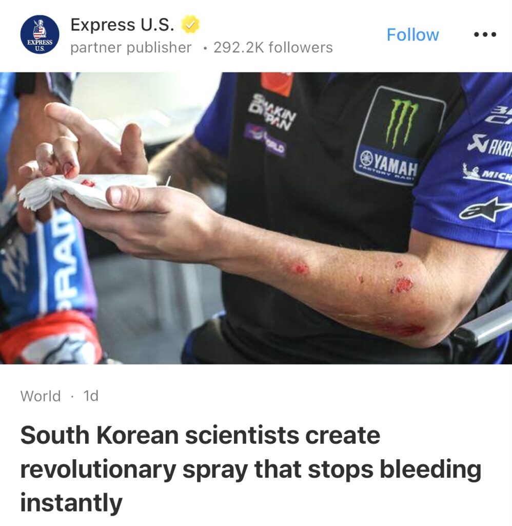 9。据Express U.S.报道,韩国科学家研发出一种革命性的止血喷雾,可瞬间止血。