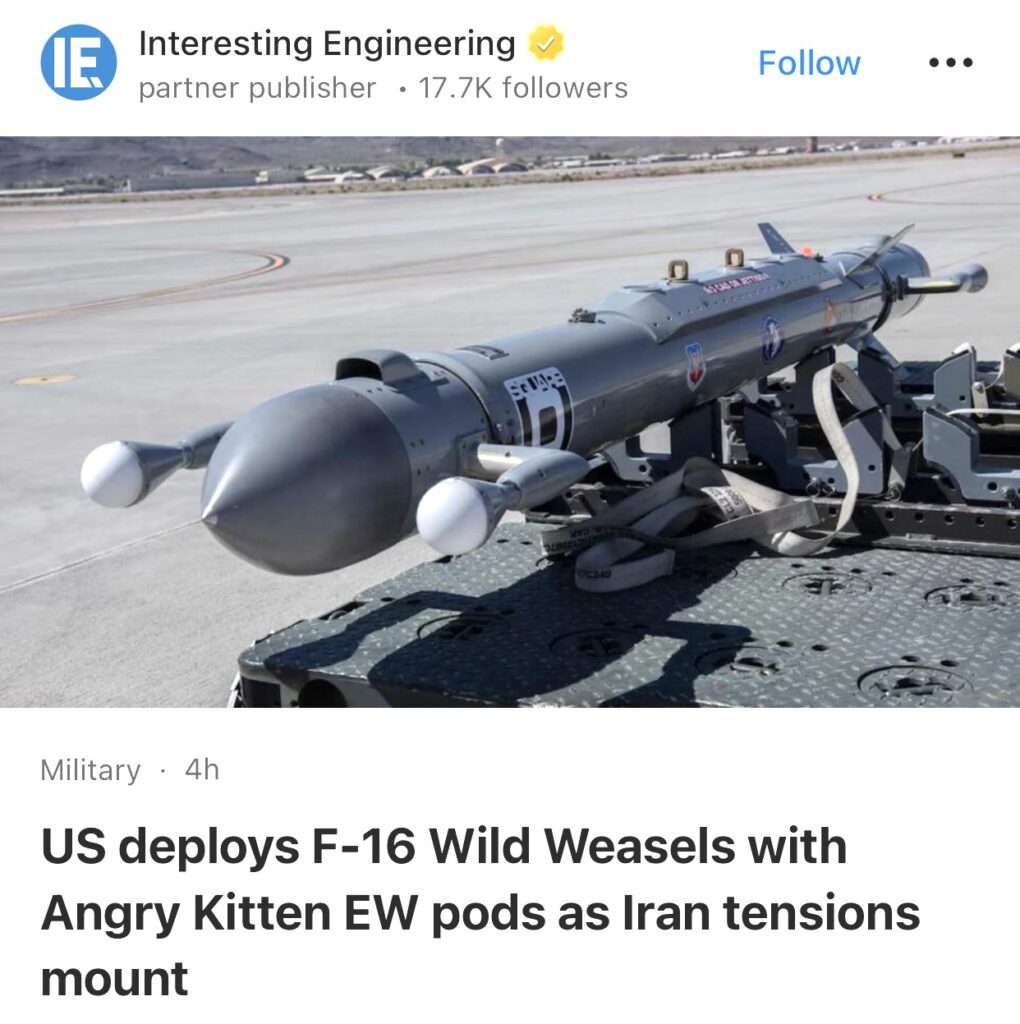 2。据Interesting Engineering报道,随着伊朗局势日益紧张,美国部署配备“愤怒小猫”电子战吊舱的F-16“野鼬鼠”战斗机。美国已向中东地区部署了一个中队的F-16CJ Block 52“蝰蛇”战斗机,这些战斗机配备了相对较新的电子战系统——“愤怒小猫”(Angry Kitten)吊舱,这是其在伊朗附近不断扩大军事部署的一部分。