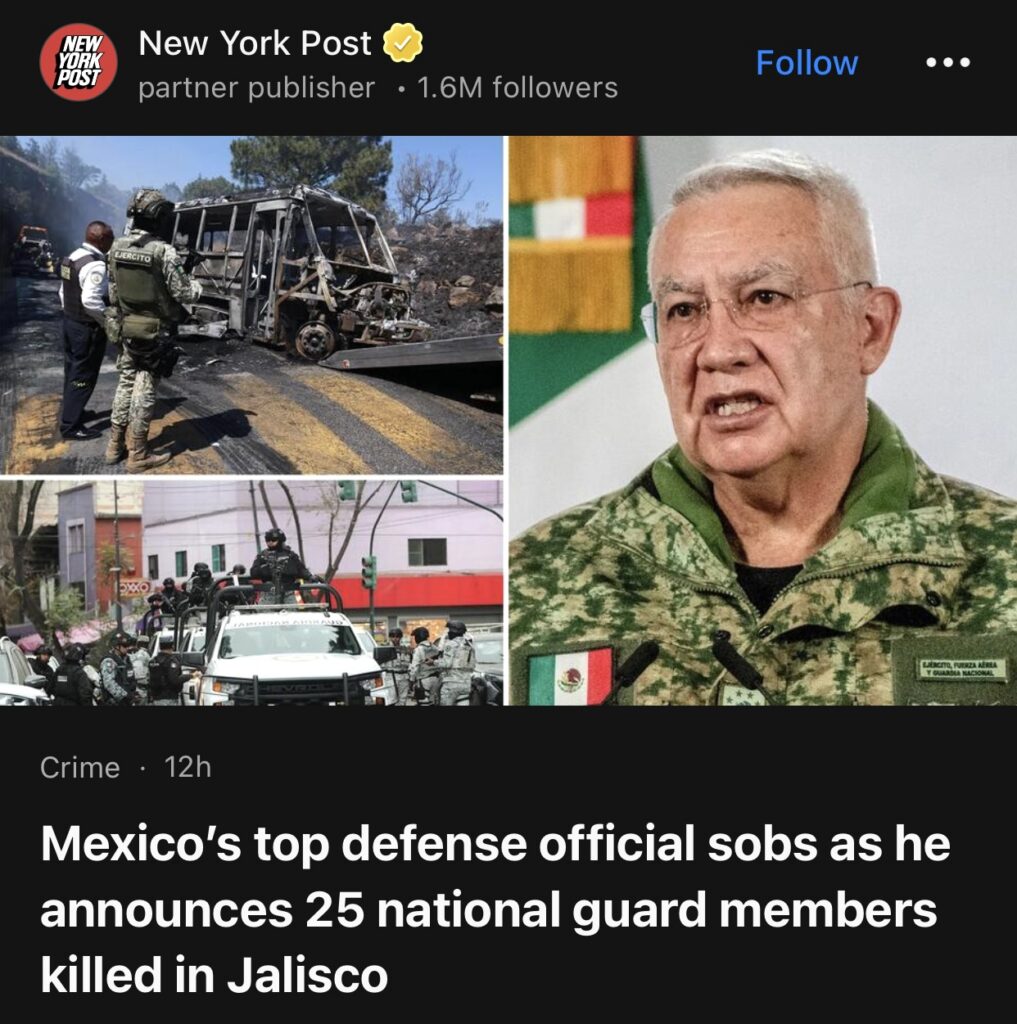 11。据New York Post报道,墨西哥最高国防官员在宣布25名国民警卫队成员在哈利斯科州遇害时泣不成声。