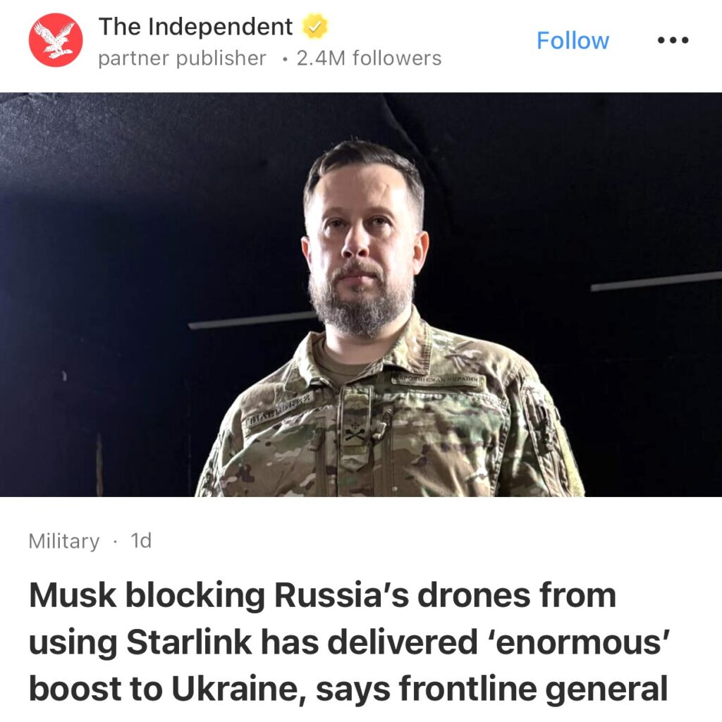 2。据The Independent报道,前线将军表示,马斯克阻止俄罗斯无人机使用星链网络给乌克兰带来了“巨大”的提振。