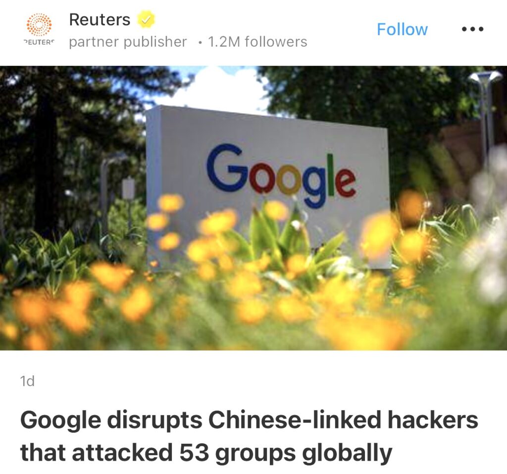 6。据Reuters报道,谷歌挫败了与中国有关联的黑客,其攻击了全球53个组织。
