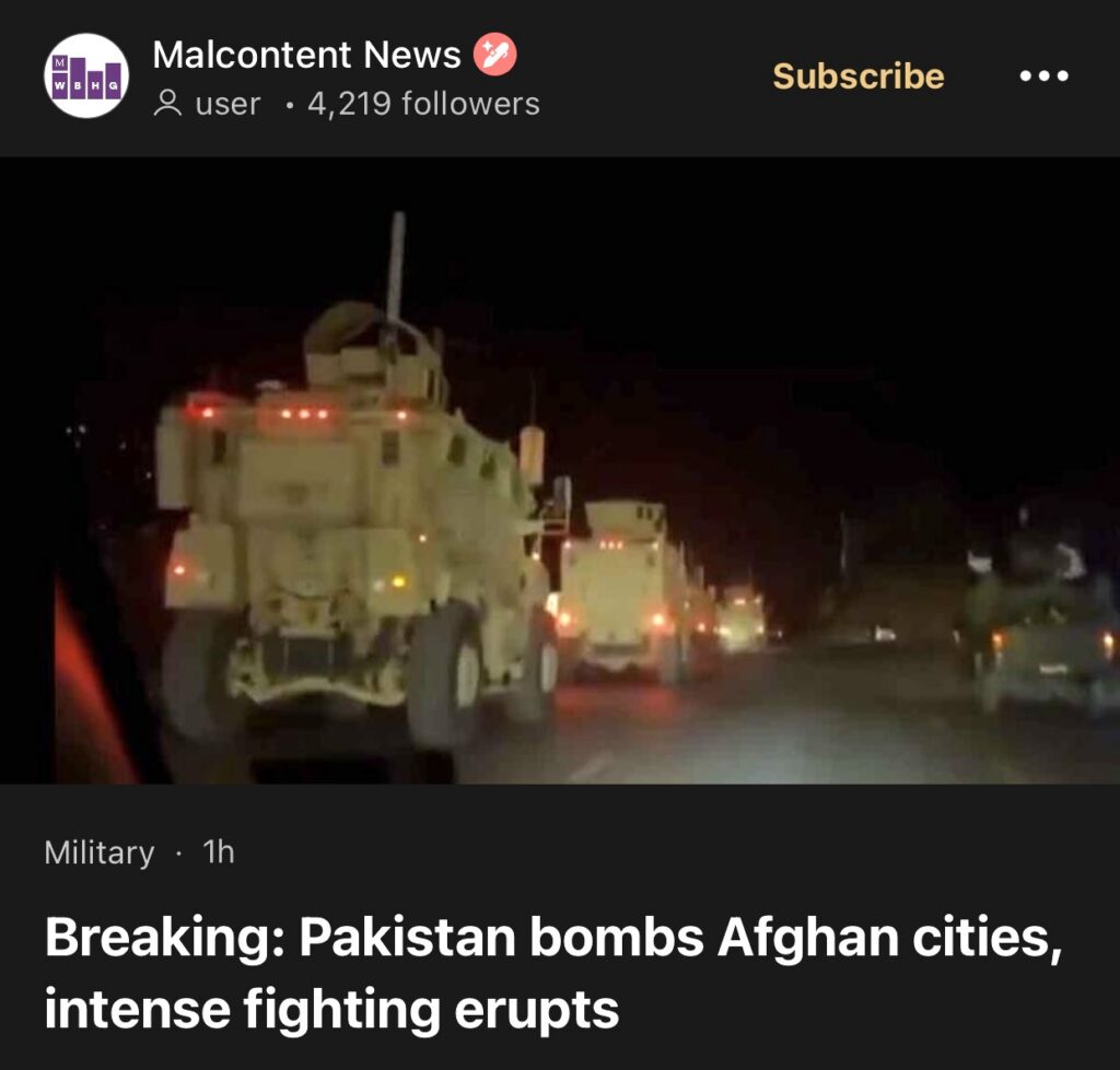13。据Malcontent News报道,突发:巴基斯坦轰炸阿富汗城市,激战爆发。