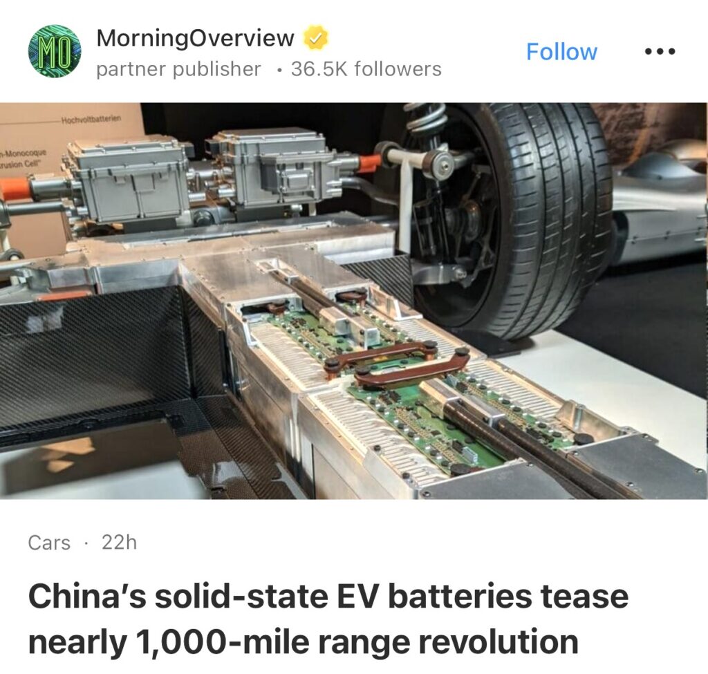 10。据MorningOverview报道,中国的固态电动汽车电池预示着近1000英里续航里程的革命即将到来。
