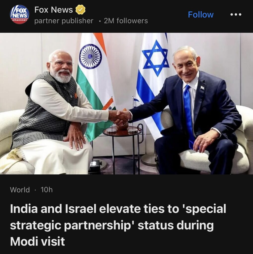 14。据Fox News报道,莫迪访问期间,印度和以色列将关系提升为“特殊战略伙伴关系”。